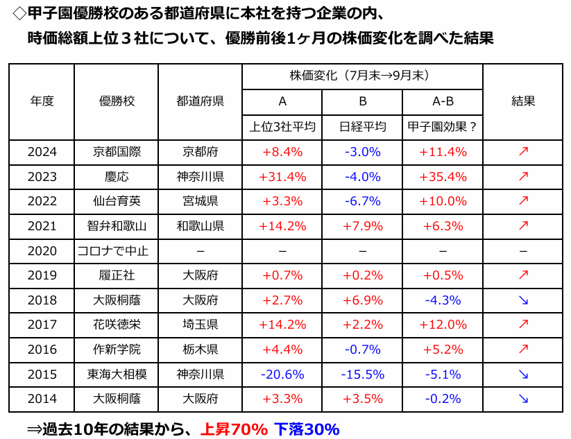 そして、優勝した高校のある都道府県は大盛り上がりとなり、企業業績ももしかしたら上がるかもしれません。ただし、あくまで都市伝説なので信じるか信じないかはあなた次第。。。
