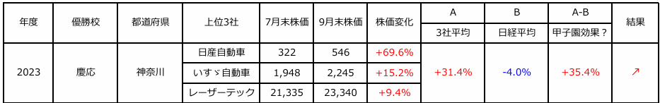優勝した神奈川では、自動車会社の上昇が目立ち、日経以上の上昇となりました。