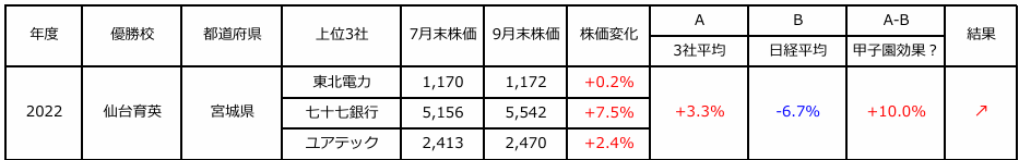 優勝した宮城県の上位3社の株価は堅調で、日経以上の上昇となりました。