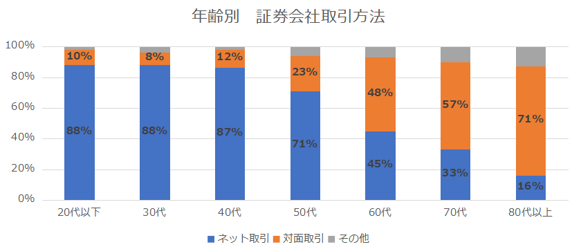 全年齢を平均すると約60%の人が、ネット取引をしています。2021年が約50%だったので、3年間で10%もネット取引を選ぶ人が増えています。