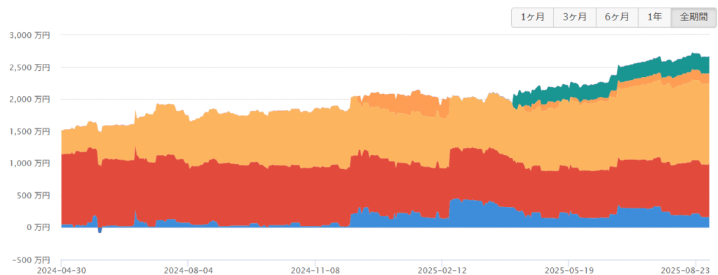 ここ最近は、現物株(赤色)は買わずに、投資信託(黄色)をひたすら積み上げている状況。2024年はかなり現金(青色)持たずの全ツッパ過ぎたので、2025年は、ある程度の現預金を持つようにしています。今年の4月のように暴落が起きたタイミングで突っ込めるようにするためにも現預金は確保。