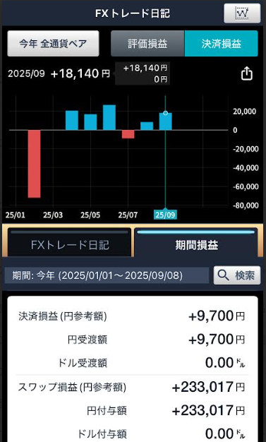 2月にトルコリラを決済した際、大きくマイナス側の決済が立っていますが、その後、コツコツドル円トレードとリラ円も少しスワップポイント狙いで保持したりして、2025年9月までやってきました。